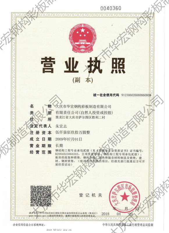 華宏鋼構始建于2009年8月9日,總部位于大慶市薩爾圖區南一路13號,現有大慶市華宏鋼構彩板制造有限公司、黑龍江省華宏力安綠建科技有限公司、大慶市華宏鋼構彩板制造有限公司長春分公司、黑龍江省海森新材料科技有限公司、大慶市瑞和通螺栓廠五家工業企業形成了以彩板復合板、裝配式鋼結構建筑、保溫材料、配件制造為主的五大生產基地,占地總面積 20余萬平方米,生產車間5萬平方米。中高層管理干部26 人,高級工程師9人,各類國家注冊執業人員 32 人,車間技工 260人,專業安裝隊伍 10 余支,帶動就業 500